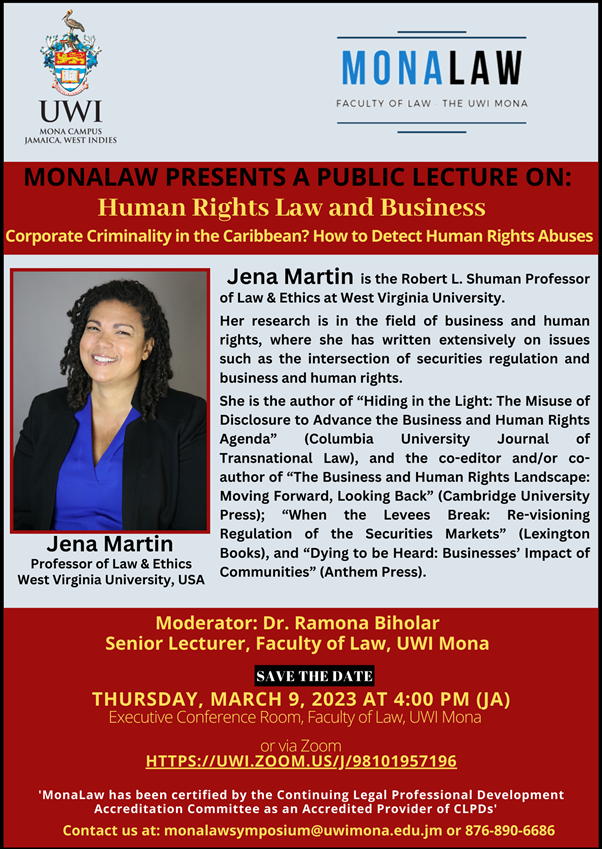 MonaLaw takes this opportunity to extend an invitation to you to join the upcoming public lecture “Human Rights Law and Business: Corporate Criminality in the Caribbean? How to Detect Human Rights Abuses”. The lecture will be delivered by Professor Jena Martin from the West Virginia University, USA on Thursday, March 9, 2023 in-person in the Executive Conference Room starting at 4:00 p.m. (JA), 5:00 pm (EC). The lecture will also be streamed live on Zoom.