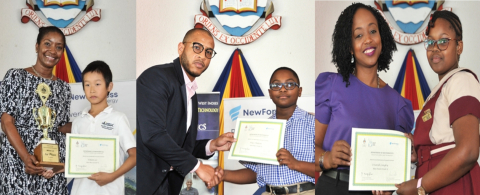 From left: Mrs. Jacqueline Burrell-Clarke from New Fortress Energy presenting Grade 3 student William Lei from AISK his first Place trophy, Mr. Stuart South from Caribbean Actuarial Association presenting Grade 4 student Bryce Hudson from Hosanna Preparatory, Ms. Renae Whitehorne from CIBC- FirstCaribbean Bank presenting Grade 5 student Crisarah Langley from Mineral Heights Primary.
