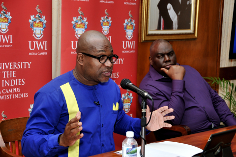 Prof. Densil A. Williams, Pro Vice-Chancellor and Principal and Dr Donovan Stanberry, Campus Registrar of the Mona Campus addressing the first Press Conference for 2024 hosted on January 15, 2024 at 10 am in the Council Room, The Senate Building, The UWI Mona Campus.