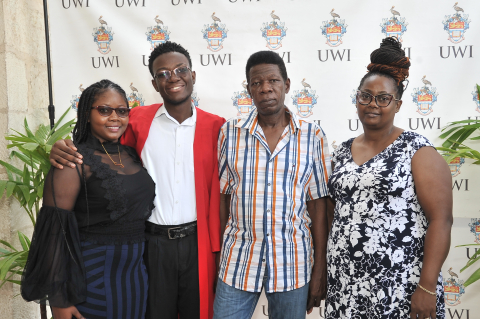 (L-R) Sister of the Top Matriculant, Ms. Sabrina Daley, Top Matriculant, Mr Orville Daley; parents Mr. Orville Daley Sr. and Mrs. Loraine Daley share lens time after the Welcome and Matriculation Service ceremony at The UWI Chapel on Sunday September 10, 2023.